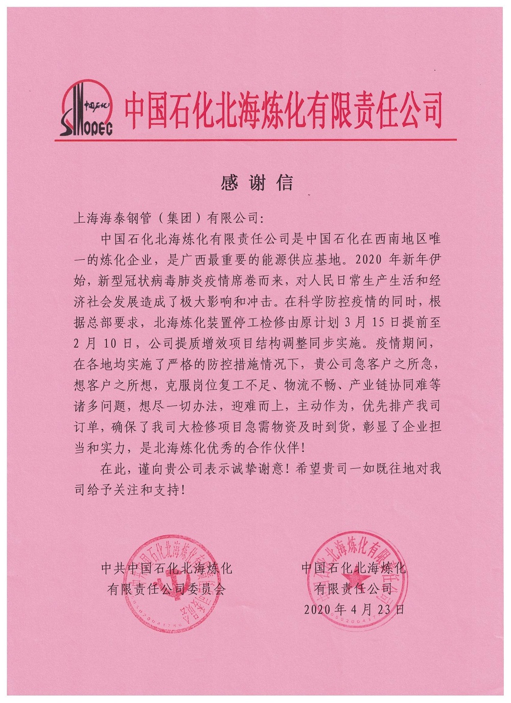 急客戶之所急 佛山海泰收到北海煉化感謝信